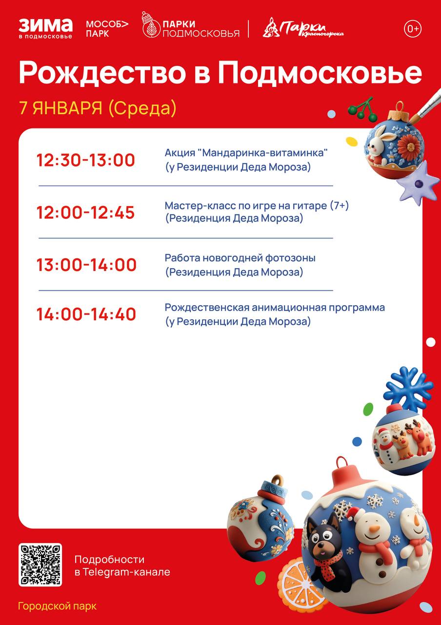 7 января в наших парках пройдут: концертные программы, акции, рождественские анимационные программы, мастер-классы и ещё многое другое!☃️