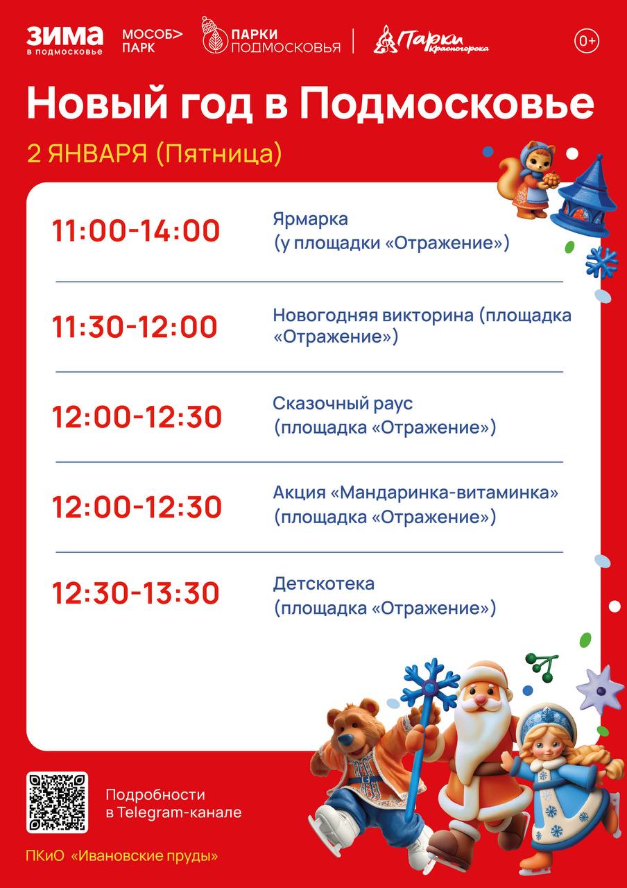 2 января в наших парках пройдут: анимационные программы, новогодние викторины, акции, ярмарки, мастер-классы и ещё многое другое!☃️